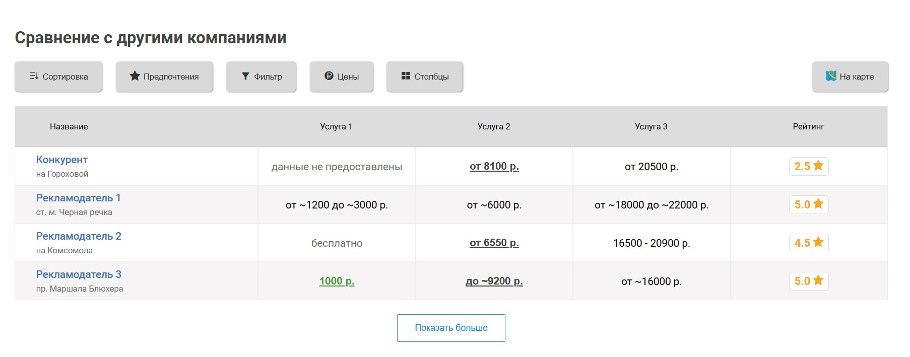 детских садов, продвигаемый детский сад попадёт к ним в таблицу «Сравнение по ценам», которая выглядит следующим образом: